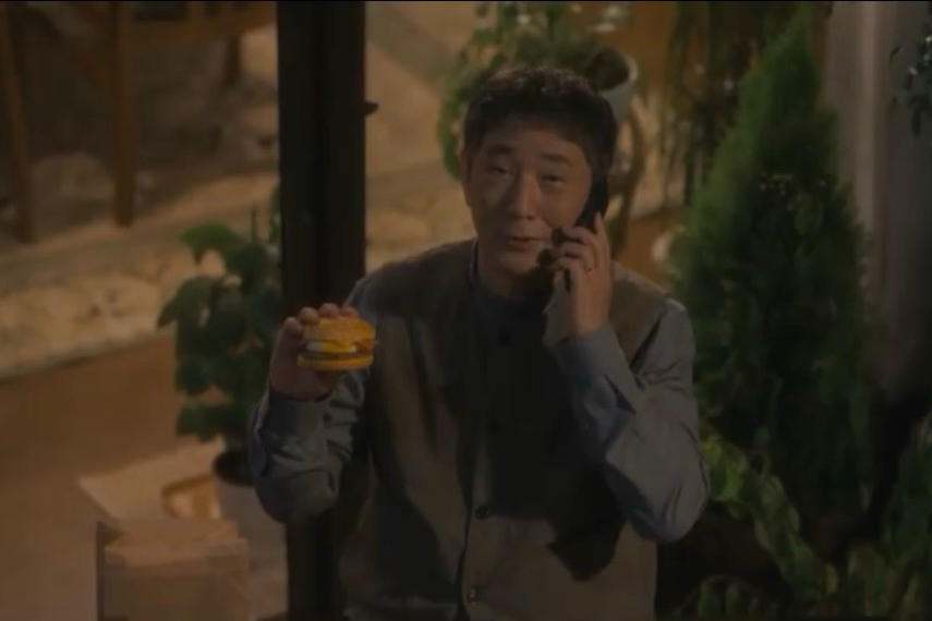 もうね、これ、あの名作、マクドナルド「月見バーガー」の持ち方と同じように、語り継がれるわざとらしさですね。