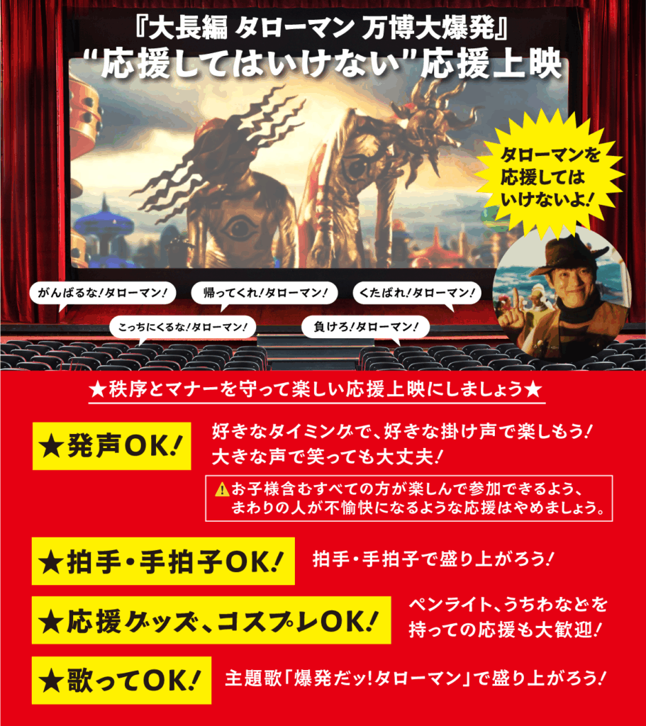 タローマンの応援上映とは、ペンライト・グッズ持参、コスプレ大歓迎の【発声OKの上映会】。