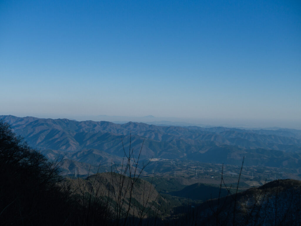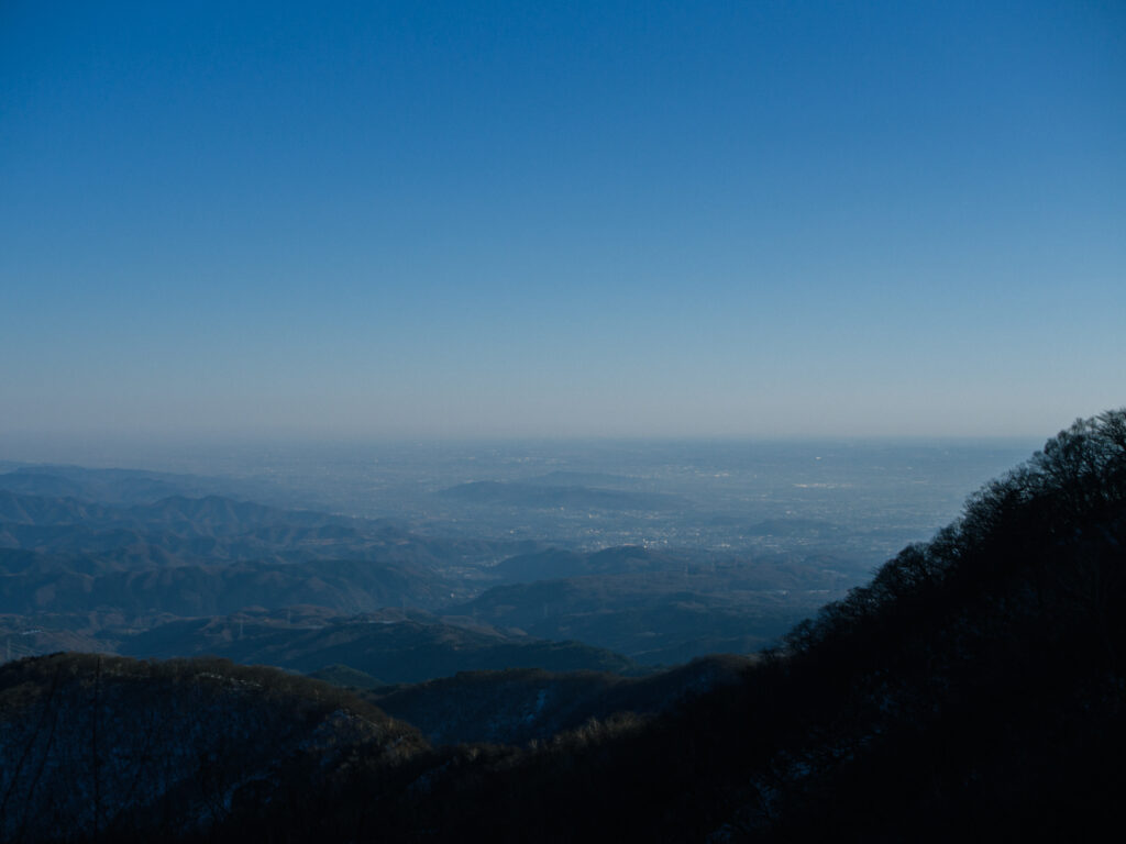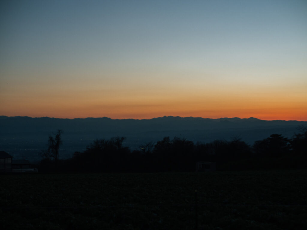 だいぶ日が傾いてきて、よし、暗くなる前に山をおりるぞと帰路に。すると、山の半分くらいまでくだったところで、空が朱と群青の幻想的な層になっていきました。