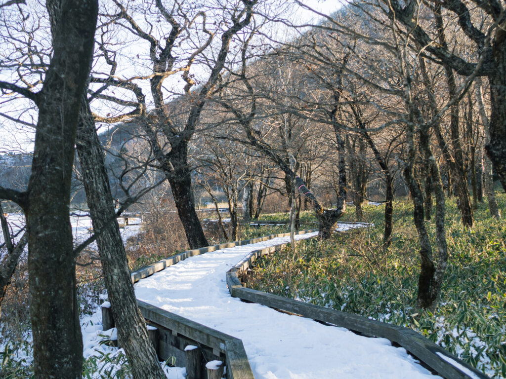 「ほぼの駅」から徒歩でも行けるそうなのですが、現在は「この道のことかな?」という歩道が雪登山状態なので、少し車でくだって覚満淵の駐車場に停めました。