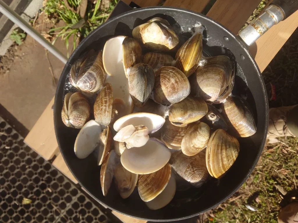 小休憩の際、こちらが持参したはまぐりを披露すると、それまで静かだった職人たちが一斉に声を上げ、すごい勢いで平らげてくれた。